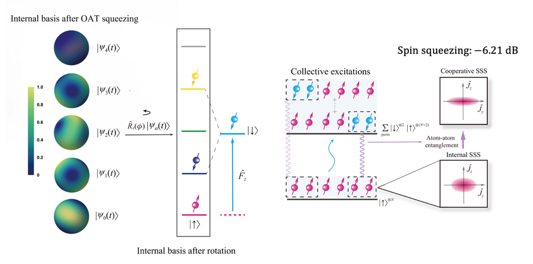 近日,肖艳红教授课题组首次在实验上实现了原子内态自旋和集体自旋的协同压缩,文章以“Cooperative Squeezing of Internal and Collective Spins in an Atomic Ensemble”为题,于11月20日发表在《物理评论快报》(Physical Review Letters)上。 原子具有光谱线宽窄、与外界电磁场相互作用强的特点,是进行精密测量的重要物理体系。原子的自旋压缩态是一种多体纠缠态,其在特定方向上的量子涨落小于自旋相干态,使超越标准量子极限的精密测量成为可能,因此在量子传感、量子信息科学领域有广泛的应用,例如原子钟、原子干涉仪、原子磁力计以及连续变量信息处理等。制备具有高压缩度的自旋压缩态一直是人们感兴趣的课题。实现自旋压缩的途径有两种,均已分别在实验上被实现:一是建立原子系综内不同原子之间的纠缠,即通过诸如量子非破坏测量或者哈密顿量演化等方法实现集体自旋压缩;二是对于多能级(超过两个)原子,可通过控制其单原子的内态自旋态,实现原子内态自旋压缩。前人的理论研究表明,恰当地联合控制内态和集体态能够增强原子系综总体的自旋压缩度,但实验研究目前仍是空白。 本文中,肖艳红课题组报道了首个实现原子内态和集体态的自旋联合协同压缩的实验。通过调控与原子相互作用的脉冲光场,在同一个原子系综内先后进行了原子内态的单轴扭曲相互作用和对集体态的量子非破坏性测量,并精细操控二者之间的相对相位,最终获得原子内态和集体态自旋的协同压缩,产生的总压缩度优于仅有一个压缩过程单独作用时的自旋压缩度,观察到 -3.57±0.67dB的自旋压缩。在加入回溯量子非破坏测量后,总压缩度进一步提高到了-6.21±0.84dB,这是迄今为止在热原子系综体系实现的最高压缩度。此外,本研究表明,具有更大的自旋量子噪声涨落(如,自旋反压缩)的原子初态有助于在量子非破坏测量反馈过程中实现更明显的量子噪声抑制。本研究中所发展的量子态操控技术在其它量子平台,例如冷原子、里德堡原子、离子阱体系中也有着广阔的应用前景。 本工作与丹麦哥本哈根大学Klaus Mølmer教授合作,由复旦大学物理学系、应用表面物理国家重点实验室肖艳红课题组主导完成,肖艳红教授和温州大学王明锋副教授、浙江工业大学张桂迎副教授为共同通讯作者,第一作者是我系博士生张有为。该项目获得了“量子通信与量子计算机”国家科技重大专项、上海市科学技术委员会项目、国家自然科学基金、山西省“1331工程”专项基金、浙江省自然科学基金,以及丹麦国家研究基金会的支持。 文章链接为:https://doi.org/10.1103/xkt1-y58b。 图1:原子内态自旋和集体自旋协同压缩原理示意图
