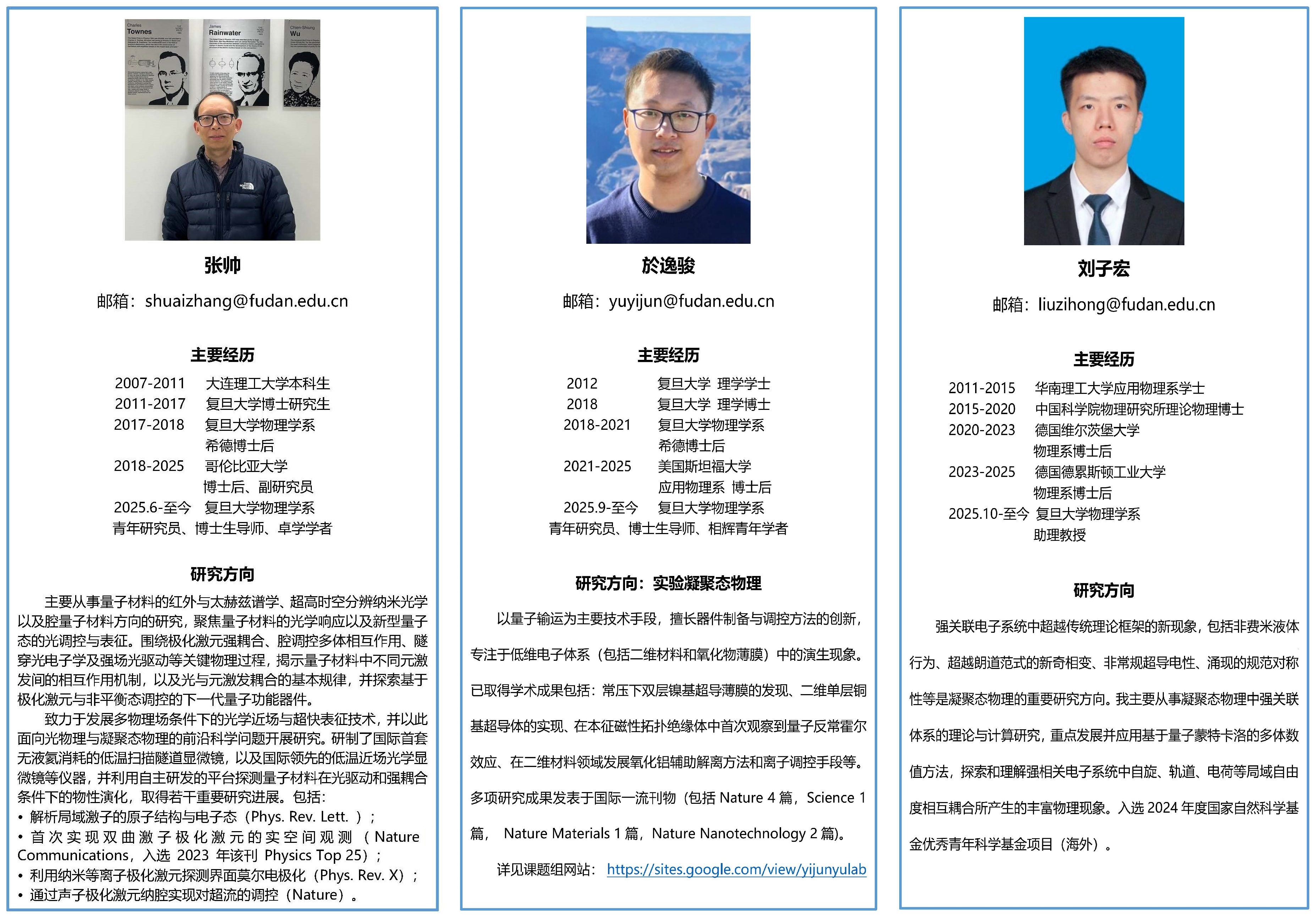 欢迎张帅、於逸骏、刘子宏老师加入复旦大学物理学系!