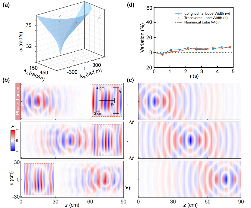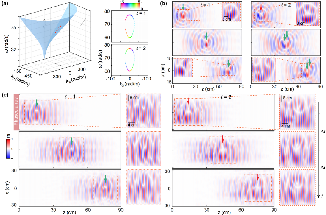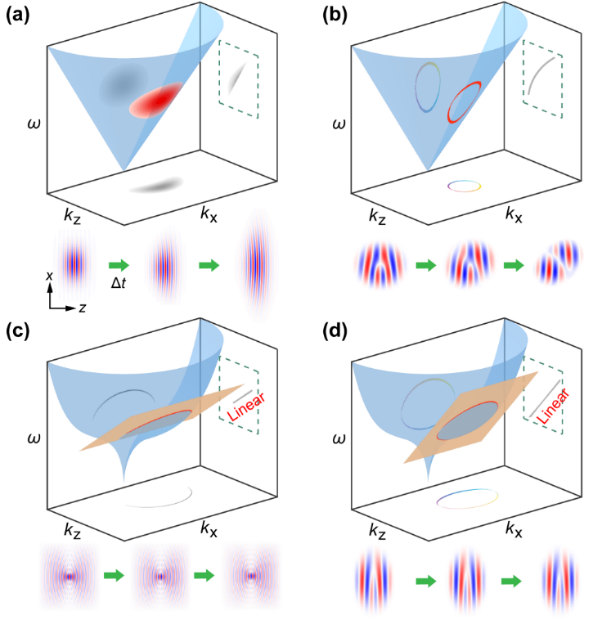 近日,复旦大学物理学系/应用表面物理全国重点实验室资剑教授、石磊教授团队在时空涡旋波包研究中取得重要研究进展。研究成果以“Propagation-invariant spatiotemporal vortices”为题发表于Sci. Bull. 70, 3758-3763 (2025).。 近年来,拓扑结构因其在波动系统中的鲁棒性及在信息编码与传输中的潜力成为物理学前沿热点。其中,时空涡旋波束(spatiotemporal vortex beams, STVBs)将涡旋调控从空间域拓展至时空域,为高维信息编码、光通信和粒子操控开辟了新路径。然而,受限于系统本征色散关系(如自由空间中的线性色散),时空涡旋在传播中易受衍射影响,导致波包展宽、高阶拓扑荷畸变甚至分裂,制约其实际应用。为此,课题组在液体表面波系统中提出了一种有效策略,该系统天然的准二维构型高度契合时空涡旋的构建与演化,为其实现稳定乃至无衍射传播提供了理想平台。 事实上,资剑教授团队自2000年代初期便率先将光子晶体调控电磁波的思想引入水波系统(获Nature highlight报道[1]),近年相继在液体表面波系统中实现可传播时空涡旋[2]、复杂拓扑波场构建[3];并于近期研制出液体表面波平板相控阵系统,实现拓扑结构的按需生成与可控传播,为本研究提供了关键实验基础。 本研究创新性地利用了液体表面波系统中存在的反常色散频段,构建出了具有恒定群速度的时空涡旋波包,首次实现了无衍射/传播不变的时空涡旋,有效克服了目前时空涡旋因衍射导致的形变及高阶拓扑荷难以稳定存在(易发生畸变或分裂)的问题,为信息传输、粒子操控等应用提供了更多的可能。 研究团队指出,在反常色散区域(即高频相速度大于低频相速度),通过一个倾斜平面与色散曲面相交,可形成闭合的频率-动量谱环(图1d),该时空耦合关系既满足了传播不变所需的群速度不变条件(即角频率与轴向动量成正比),又能承载螺旋相位。这一机制解决了传统传播不变波包与时空涡旋之间的内在矛盾,从而实现了兼具拓扑特性与传播不变特性的时空涡旋波包。 研究团队通过自主搭建的液体表面波相控阵系统,利用液体表面波天然存在的反常色散区域,将目标频率-动量谱 E(kx, ω) 反演为时域驱动信号,精确激发所需波场(图2b)。 作为参照,团队首先激发了传统贝塞尔型时空涡旋(图3b)。实验清晰显示:携带+1拓扑荷的时空涡旋在传播过程中发生明显的斜向拉伸变形;而+2拓扑荷则迅速分裂为两个+1拓扑荷,表现出显著的不稳定性。 相比之下,基于本文提出的理论所激发的传播不变时空涡旋(图3c),无论携带+1还是+2拓扑荷,在传播约40倍中心波长后,其波包的横向与纵向尺寸几乎保持不变,且+2拓扑荷未发生任何分裂,展现出高度稳定的拓扑结构,验证了新机制的无衍射/传播不变特性。 本研究首次在实验上实现了传播不变的时空涡旋波包,为长期困扰该领域的衍射展宽与拓扑荷分裂问题提供了一种有效解决方案。通过巧妙协同调控系统的色散特性与频率-动量谱的时空耦合关系,团队不仅验证了理论构想,也有力推动了高鲁棒性拓扑时空波包研究的发展。 另一方面,液体表面波平台作为一种经典、易于观测且高度可控的波动系统,能够有效模拟复杂的波动现象,从而反哺光学及其他波动体系的研究,为探究光学及其他体系中难以直接观测的物理现象与基本原理提供直观、可控的实验平台。 论文的共同第一作者为复旦大学的叶俊燚博士生、车治辕博士,通讯作者为复旦大学的车治辕博士、刘文哲青年研究员、石磊教授和资剑教授。本研究得到了国家重点研发计划、国家自然科学基金、上海市科委及中国博士后科学基金等项目的支持。 论文链接:https://doi.org/10.1016/j.scib.2025.10.001 Nature 428, 713, 2004 Z. Che, W. Liu et al., Phys. Rev. Lett. 132, 044001 (2024). B. Wang, Z. Che et al., Nature 638, 394-400 (2025). 图1. 四类时空波包在频率-动量域中的构建原理示意图:(a) 高斯脉冲波束,随传播而展宽;(b) 传统贝塞尔时空涡旋光束,随传播涡旋畸变或分裂;(c) 普通传播不变时空波包,传播不变但不附带拓扑结构;(d) 传播不变时空涡旋,利用反常色散同时实现闭合谱环和恒定群速度,传播过程形状不变。 图2. 传播不变类贝塞尔时空波包的实验观测:(a) 频率-动量域的闭合谱环关系;(b) 实验测得的波包传播过程;(c) 对应的数值模拟结果;(d) 横向与纵向主瓣宽度随时间的变化。 图3. 传统与传播不变时空涡旋波包的实验结果:(a) 传播不变时空涡旋的谱结构及+1、+2拓扑荷的螺旋相位;(b) 传统时空涡旋在传播中发生形变和+2拓扑荷分裂;(c) 传播不变时空涡旋保持轮廓与拓扑荷稳定。