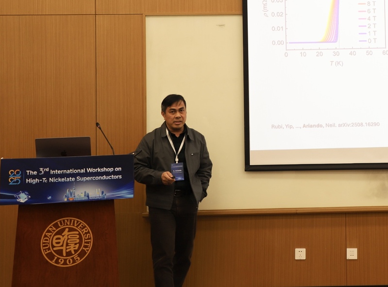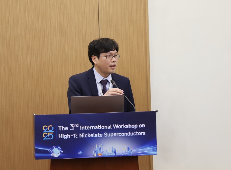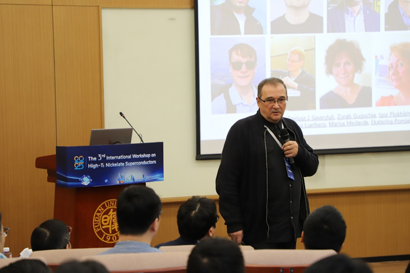 2025年12月5日至7日,第三届镍基高温超导国际研讨会(The 3rd International Workshop on High-Tc Nickelate Superconductors)在复旦大学江湾校区交叉一号楼顺利召开。会议由复旦大学物理学系、应用表面物理全国重点实验室、复旦大学微纳电子器件与量子计算机研究院联合主办,上海科技大学物质科学与技术研究院协办,复旦大学赵俊教授担任大会主席。 本次研讨会共吸引了海内外一百余位专家学者参会,其中近四十位领域内的重要学者出席会议作邀请报告。与会代表们围绕超导机理、材料设计、高质量样品制备以及先进测量技术等关键科学问题展开了深入而富有成效的讨论。会场学术氛围热烈活跃,思想交锋密集而富有深度,充分体现了镍基超导研究的蓬勃发展态势。 镍氧化物超导体系作为继铜氧化物和铁基之后的新一代高温超导平台,正处于快速发展和持续突破的关键阶段。本次研讨会的成功举办,不仅为全球相关研究团队搭建了高水平的交流与合作平台,也进一步彰显了复旦大学在凝聚态物理和量子材料领域的国际影响力与引领作用。 来自海内外的参会专家们在会场前合影 大会主席赵俊教授主持发言,介绍了研讨会相关背景及本届参会专家情况。 来自日本大阪大学的 Kazuhiko Kuroki 教授作题为“Bilayer Hubbard model as an effective minimal model for the high Tc superconductor La₃Ni₂O₇”的报告。他通过构建双层 Hubbard 最简模型,深入解析了镍氧化物中驱动高温超导的关键电子关联机制。 来自德国波鸿鲁尔大学的 Ilya M. Eremin 教授带来“Superconductivity in bilayer nickelates: low-energy models and competing instabilities”的报告。他系统探讨了双层镍酸盐中的低能有效模型与竞争序态,为揭示镍基超导体的电子结构、关联效应及不稳定性提供了理论视角。 来自新加坡国立大学的 A. Ariando 教授作题为“Magnetic-field-induced superconductivity and magnetic order in the infinite-layer nickelate SmEuCaNiO₂”的报告,展示了无限层镍氧化物体系独特的磁场诱导超导再入现象。 来自瑞士保罗谢尔研究所(PSI)的 Rustem Khasanov 教授带来“Isotope-dependent density-wave transitions in Ruddlesden–Popper nickelates La₃Ni₂O₇ and La₄Ni₃O₁₀”的报告。他展示了双层和三层镍氧化物中密度波序和超导电性的同位素效应的最新结果,为理解镍氧化物的电子相竞争和超导机理提供了线索。