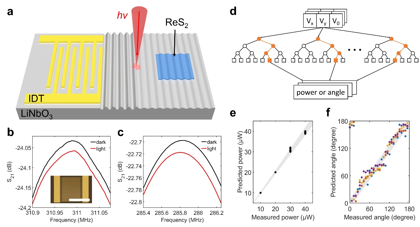 近日,复旦大学物理学系修发贤课题组基于各向异性二维材料ReS2和压电材料LiNbO3,发现了可被声表面波调控的光电响应各向异性,并使用机器学习算法实现了对光的多维度同时探测。2026年4月10日,相关成果以《由声电控制的光电各向异性实现的可重构偏振探测》(Acoustoelectric Control of Optoelectronic Anisotropy for Reconfigurable Polarimetry)为题在线发表于期刊《科学·进展》(Science Advances 12, eaec4337 (2026))。该项工作由复旦大学物理学系修发贤课题组、微纳电子器件与量子计算机研究院张成课题组合作完成。 光的偏振是与强度、波长并列的基本物理属性,携带了丰富的信息,在光通信、光学成像、环境感知等领域具有不可替代的作用。传统偏振测量仪通常依赖时间分割、振幅分割、孔径分割或焦平面分割等方案,需要使用偏振片、波片、分束器等光学元件来实现光场的空间或时间分离。这些系统虽然行之有效,但往往体积庞大、机械结构复杂,且难以进行片上集成。近年来,一种新兴的替代方案引起了广泛关注,即利用低对称二维材料的本征各向异性来实现偏振光电探测。 然而,单一各向异性材料的响应具有二重对称性,无法区分镜像对称的线偏振态,因而限制了全面的偏振表征能力。为突破这一对称性限制,学术界已探索了多种策略,包括将晶轴错位排列的二维材料进行堆叠,以及集成具有人工各向异性的纳米结构超表面等。虽然这些方案可以扩展偏振探测能力(例如实现全斯托克斯测量),但其响应完全由制备时定义的层间取向或几何结构决定,本质上是静态的、缺乏动态可调性。 在本工作中,研究团队提出了一种全新的思路:将压电衬底上的表面声波与二维半导体耦合,实现对器件偏振响应的动态、原位控制。表面声波由耦合的应力场和压电场组成,集中在压电衬底表面传播。实验中,研究团队将薄层ReS2转移堆叠至128° Y切LiNbO3衬底上,并在衬底表面制备叉指换能器以激发表面声波。研究团队首先在器件中展示了声电耦合控制的光电响应。光电压扫描测量显示,ReS2邻近的衬底区域展现出显著的光伏信号。考虑到LiNbO3的宽能隙(3.56 eV),这一对于低于能隙能量光的响应行为出乎意料。且对照实验表明声表面波与这一反常信号密切相关,暗示其背后存在超越传统光生电子-空穴对机理的声电耦合机理。 为此,研究团队提出了如下的机理模型:叉指换能器激发的表面声波沿LiNbO3表面传播,在ReS2中产生声电效应。而激光照射可以引起局域温升,导致材料热膨胀并改变其弹性、压电和介电系数,进而改变局域的声速,引起声波的散射和反射,从而使声表面波幅值衰减。受激光调制的声表面波与ReS2相互作用,进一步产生受调制的声电信号。这一新机理被称为光热-声电效应。 图1. 光热-声电机理和基于此效应的多维度光电探测。a,光热-声电效应的机理示意图。b,实验测量得到的,不同光照条件下叉指换能器传输参数的对比。插图为叉指换能器的光学图像。标尺代表200微米。c,有限元仿真得到的,不同条件下叉指换能器传输参数的对比。d,随机森林算法示意图。e,训练后算法对功率的预测结果。灰色区域代表实验误差。f,训练后算法对偏振角度的预测结果。数据点颜色代表所属功率。灰色区域代表实验误差。 为验证这一机理,团队测量了叉指换能器的传输参数S21。在聚焦型叉指换能器中,光照导致传输系数整体在频率上的移动,和衬底升温造成的变化一致。而在平面型叉指换能器中,光照导致传输参数幅值的下降。使用有限元仿真软件COMSOL对平面型叉指换能器建模,计算得到的传输参数在光照下的变化行为和实验测量结果高度一致,强有力地支持了声表面波衰减的光热起源。 随后,研究团队还发现光热-声电机理存在线偏振依赖,且其偏振依赖对称性和声表面波传播方向不一致。使用偏振拉曼光谱表征128°Y切LiNbO3衬底的各向异性,发现其拉曼散射峰强度展现出与光热-声电信号相同的对称性。此外,声表面波的相位变化也表现出相同的偏振依赖对称性。这些发现揭示了光热-声电机理的偏振依赖性根植于128°Y切LiNbO3衬底的对称性。 基于上述机理,研究团队设计并制备了由少层ReS2和两组正交叉指换能器组成的器件。当改变声波功率时,可以实现对偏振依赖对称性的动态调控。接着,研究团队利用该器件演示了对光功率和线偏振的同时探测。通过分别施加不同方向的声表面波以及 施加声表面波,可获取三个不同的光电响应参数。研究团队训练随机森林算法来提取这些光电响应中编码的光信息。结果显示,训练后的模型对光功率预测的均方根误差仅为0.40,对线偏振角度预测的均方根误差为10.21,均小于实验的误差范围,充分证明了光热-声电效应用于多维度光电探测的可行性。 综上所述,该工作建立了一种由声电耦合驱动的全新光电效应。其中光照通过光热效应调制表面声波幅度,进而调控声电响应。传输参数的实验和模拟表明其起源于升温引起的体积膨胀和材料系数变化。尤为重要的是,表面声波使得ReS2/LiNbO3异质结构的偏振响应能够被连续、动态地重新配置,从而在紧凑的平面架构中实现光功率和线偏振态的同时测量。这项工作展示了二维材料中声电工程的全新范式,为可重构多维度光电探测开辟了新的方向。 该项研究工作得到了复旦大学物理学系、应用表面物理国家重点实验