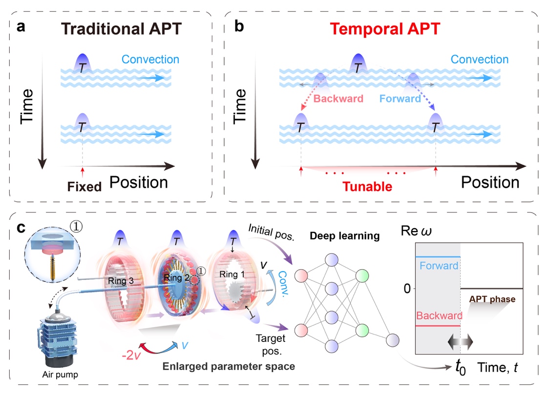 近日, 复旦大学物理学系/应用表面物理全国重点实验室黄吉平教授课题组与新加坡国立大学仇成伟教授课题组合作,在非厄米物理与扩散超构材料交叉方向取得新进展:提出并实验验证了“时间调制反宇称时间对称性”原理,首次在对流-扩散体系中实现温度波包的按需双向输运与定点俘获——既可随对流顺流而下,也可逆流而上,并可在任意目标位置精准锁定。相关研究成果以“Temporal anti-parity-time symmetry in diffusive transport”为题,于2025年12月10日发表于《Nature Physics》(https://doi.org/10.1038/s41567-025-03129-8)。我系黄吉平教授与新加坡国立大学仇成伟教授为论文的共同通讯作者;我系2024届博士毕业生金鹏博士(来自上海理工大学理学院变换热学、统计物理与复杂系统研究中心,现为新加坡国立大学Research Fellow)、我系博士生王成猛、周宇鸿、新加坡国立大学博士生杨水华为论文的共同第一作者;合作者还包括我系2023届博士毕业生杨福宝博士(现为中国工程物理研究院研究生院博士后)、我系2025届博士毕业生刘晋榕博士(现为上海理工大学理学院教师)、上海交通大学博士生孙娅、我系2025届博士毕业生庄鹏飞博士、我系博士生张奕扬、我系2022届博士毕业生须留钧博士(现为中国工程物理研究院研究生院副研究员)、新加坡国立大学周毅博士以及新加坡国立大学Ho Ghim Wei教授。 图:工程设计时间调制反宇称时间对称性。a, 传统反宇称时间对称性:抑制对流实现局域俘获,热波包随时间逐渐衰减。b, 时间调制反宇称时间对称性:在相同对流条件下可编程地顺流/逆流输运温度波包,并在任意位置锁定。c, 实验平台与时序协议:三同心旋转环与介质/速度的同步切换,深度学习预测最优切换时刻。 以光场“夹住”并操控微粒、细胞和病毒的光镊技术曾两度摘得诺贝尔物理学奖(1997年、2018年),深刻塑造了人类对微观世界的操控方式。受此启发,课题组与合作者将“镊子操控颗粒”的理念推广为“镊子操控能量”的新路径,运用非厄米宇称时间/反宇称时间对称性的思想,将对能量与信息流的精细调控从波动体系拓展至扩散体系。尽管近年来扩散超构材料中已涌现出热局域、热拓扑态等重要进展,但大多仍停留于“静态范式”,即功能在设计阶段即被固化为特定相态,难以实现对能量在时间域内的主动抓取、拖拽与定点捕获。打破这一瓶颈的关键在于:能否将“相变何时发生”变成可编程的自由度,把非厄米控制从“设计空间结构”升级为“编排时空过程”。 围绕这一核心问题,本工作提出“时间调制反宇称时间对称性”的新原理,将非厄米相变的触发时刻视作可直接“下达的命令”,通过在恰当时刻非绝热地切换材料属性与对流状态,精确跨越奇异点(EP点),从而把系统的输运历史写成可控的“时间脚本”。研究团队构建了可重构的“三环热超构材料”实验平台,采用“两个阶段、一个时刻”的时间协议:在起始的“输运阶段”,环一、环二、环三以相同的转速v运转(或,环一v;环二、环三-2v)。使环一上的温度波包可按需顺流推进(或,逆流而上);当到达预设的切换时刻t时,系统同步执行材料与速度的双重切换——中间环的嵌入介质由空气瞬时替换为铜,第二环停止旋转、第三环反向至-v,而第一环保持旋转——使环间热交换率h跨越奇异点阈值(h > hEP),系统进入“俘获阶段”,温度波包在目标位置被锁定。为确定最优切换时刻,引入深度学习模型,以温度峰值的初始与目标位置为输入预测t,从而实现对温度波包在时空中的精准调度。由此,系统首次在对流-扩散体系中实现了“镊子式”的热操控:既能沿对流方向高效传输并定点俘获,也能逆对流方向实现反常输运并在任意位置稳固锁定。 该研究将扩散体系中的非厄米物理从“静态相”拓展至“可编程的时空脚本”,以“能量镊子”的形式为按需能量管理提供了全新工具,展示了在智能热管理中的直接应用前景,有望在微电子与算力系统中将冷却能量主动引导至关键单元,在热电与可再生能源领域通过动态塑造温差场突破静态效率瓶颈。更重要的是,这一时间调制对称性范式提供了波与能量“四维(时空)控制”的通用蓝图,可望拓展至光、声与自旋等平台,实现光脉冲按需存储与释放、冲击波拦截以及自旋波的精确引导,推动超构材料设计从“空间中的静态响应”迈向“时间调制的动态演化”。 《Nature Physics》期刊编辑总结评价此文:“Applying concepts from non-Hermitian physics to diffusive systems enables static control of heat transport. Now, this notion is expanded to dynamic control, including a demonstration of programmed thermal transport in a metamaterial.”。